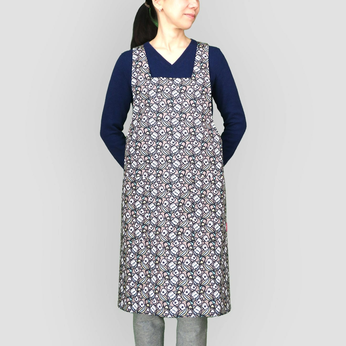 ヒモやボタンがなくてさっとかぶって着るだけの軽い着心地のエプロン。