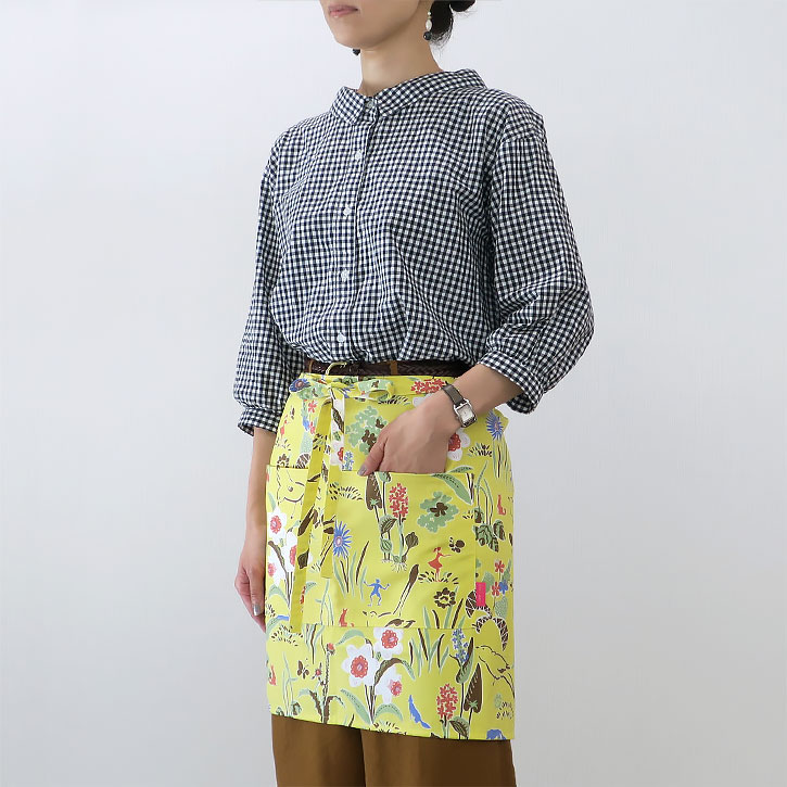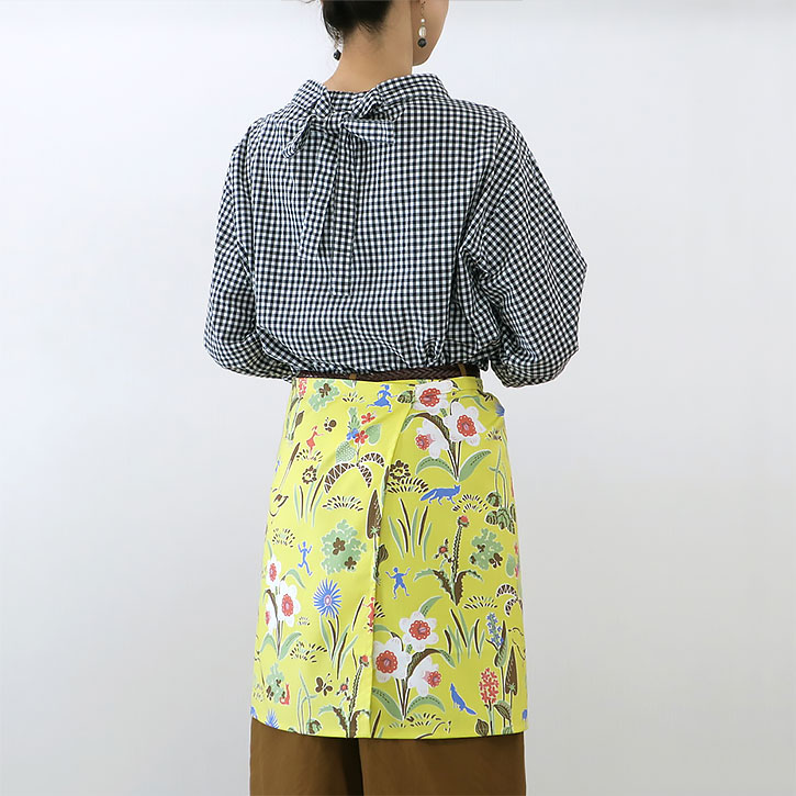 頭や腕を通さない腰巻きタイプのシンプルエプロンなので、